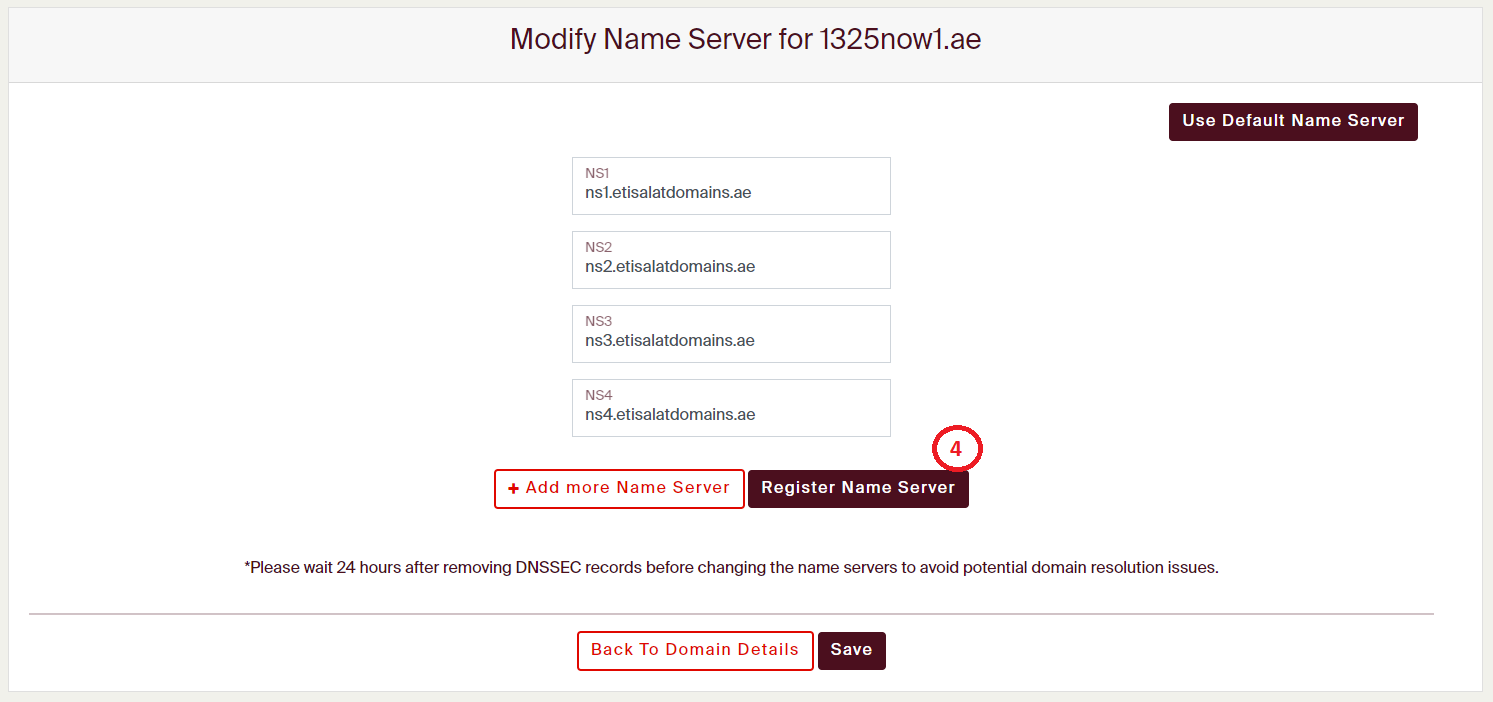 Step 6: Click 'Register Name Server' button to submit the new name server.