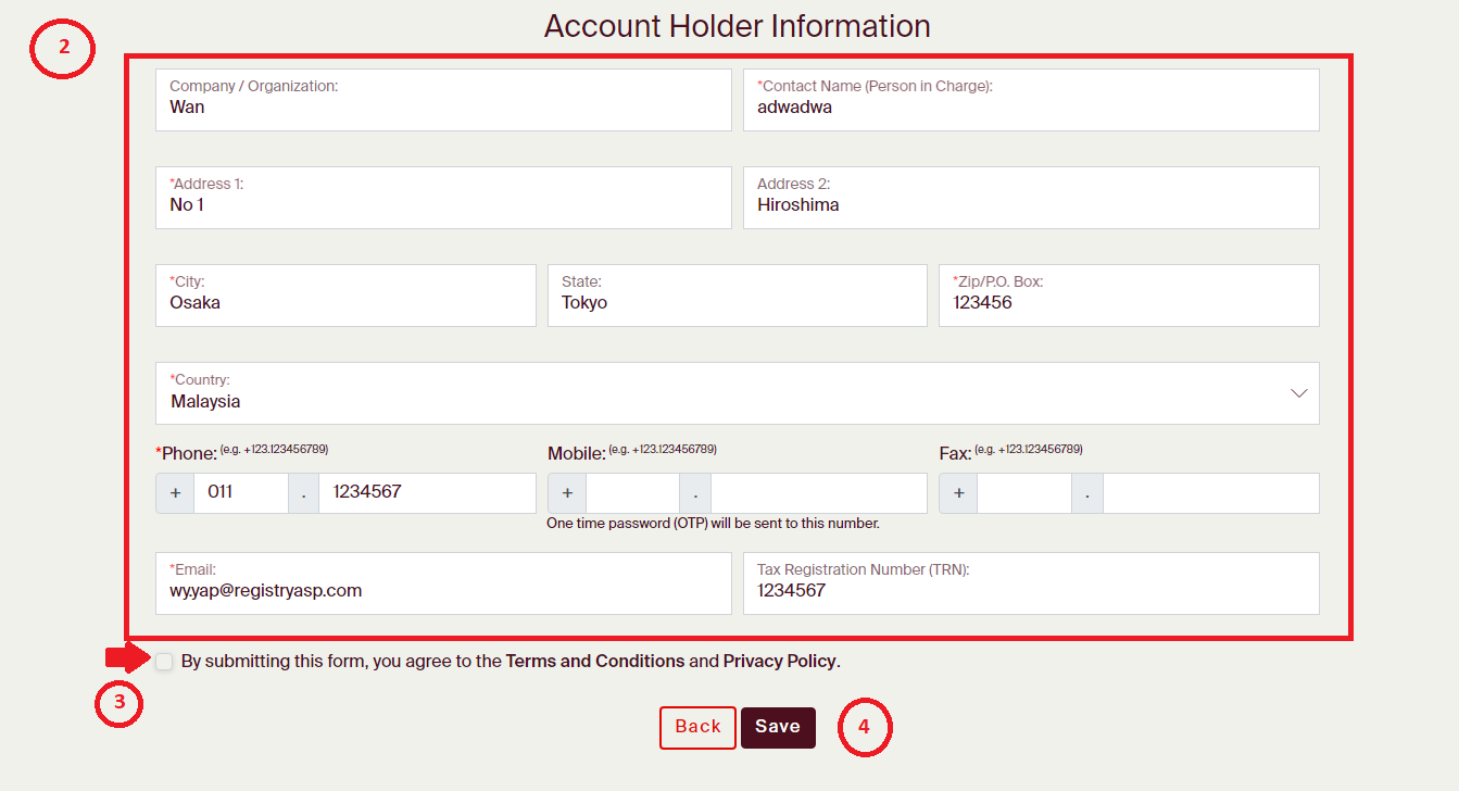Step 2: Fill in all the fields. This information will used as your WHOIS. All information marked in asterisks (*) must be filled in order to save the edited profile.